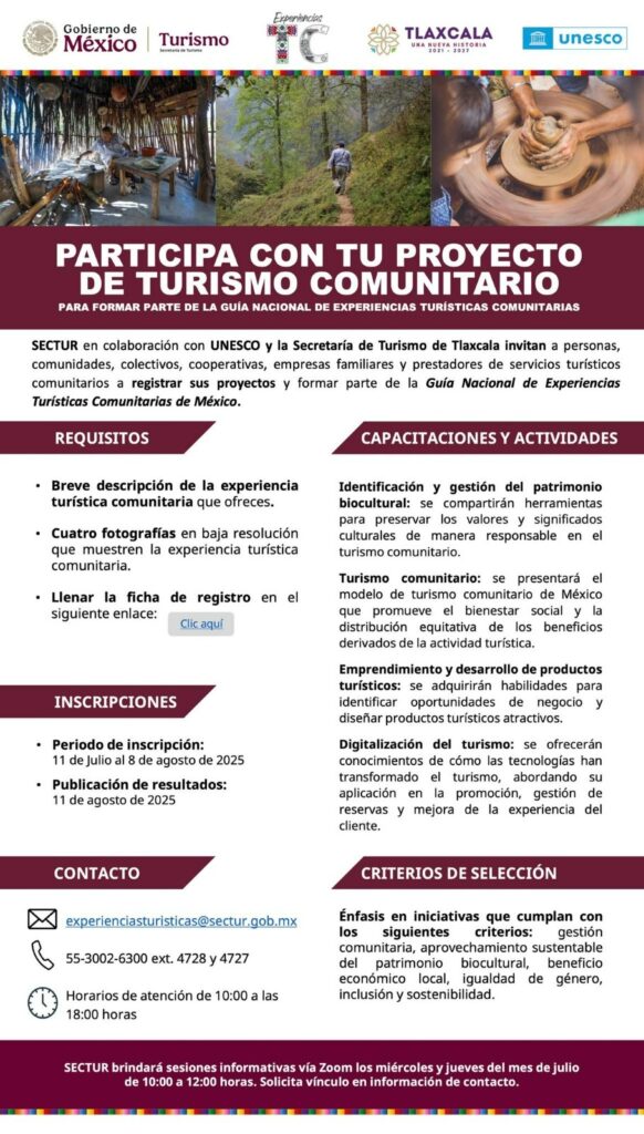 La Secretaría de Turismo del Estado (Secture) hace un llamado a comunidades, colectivos, cooperativas, empresas familiares y prestadores de servicios turísticos comunitarios a inscribirse en la convocatoria y mostrar al país la riqueza viva de su cultura, tradiciones y saberes que resguarda Tlaxcala.