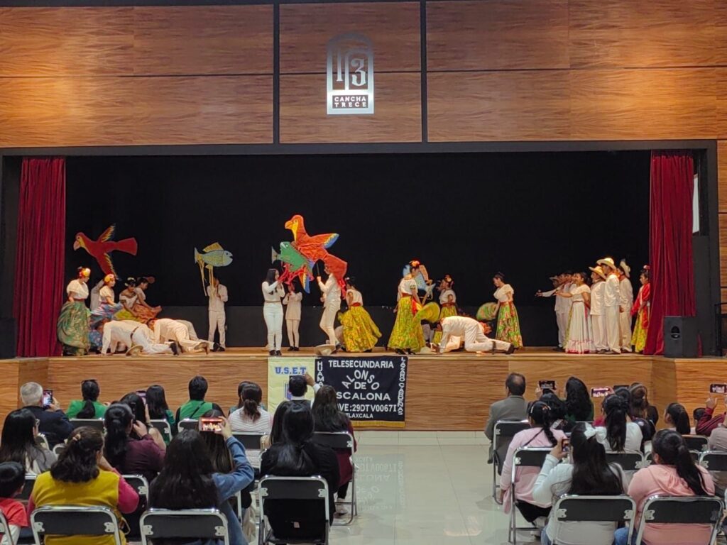Como parte de las actividades culturales de la Feria Internacional del Arte Efímero y la Dalia Huamantla 2025, alumnas y alumnos de la Telesecundaria Alonso de Escalona, ubicada en la comunidad de Lázaro Cárdenas, Huamantla, se presentaron en la Cancha 13, ofreciendo un emotivo espectáculo lleno de tradición, ritmo y orgullo huamantleco.