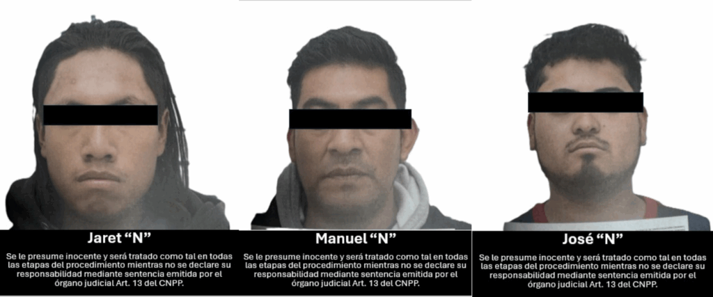 Los imputados, identificados como Miguel “N”, Jovani “N”, Fabián “N”, Edgar “N”, Juan “N”, Rodrigo “N”, Jaret “N”, Manuel “N” y José “N”, fueron detenidos en flagrancia durante un operativo realizado en el municipio de Calpulalpan.