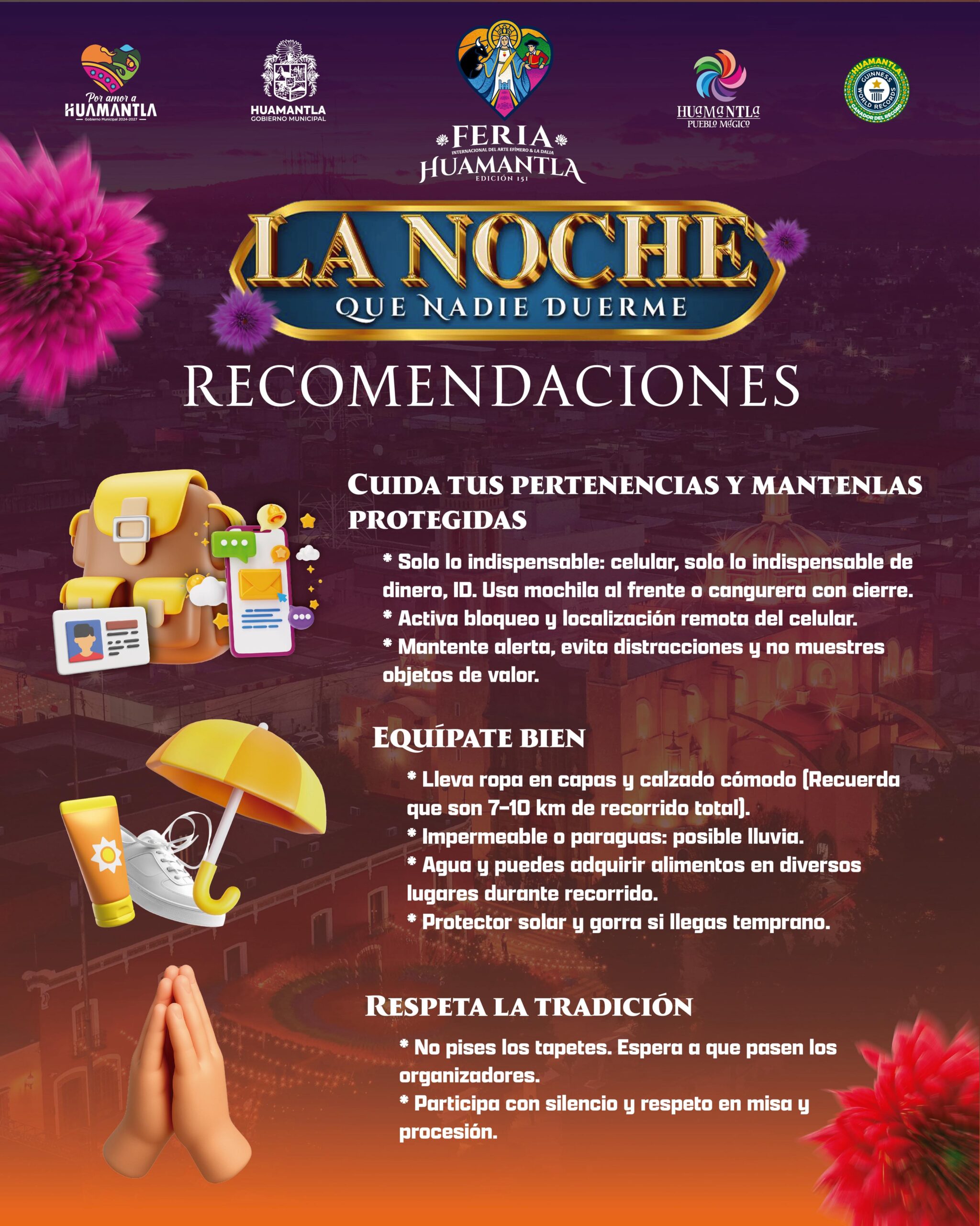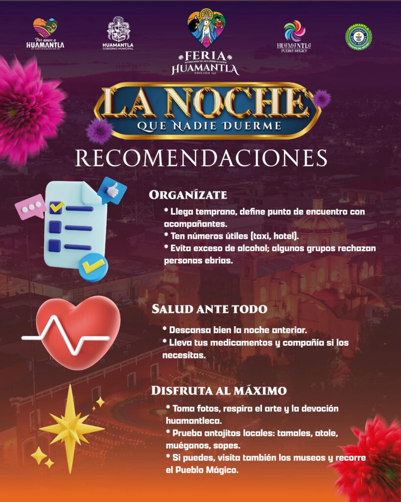 Con el objetivo de que habitantes y visitantes vivan de manera plena y segura la Noche que Nadie Duerme, el Gobierno Municipal de Huamantla, que preside Salvador Santos Cedillo, emitió una serie de recomendaciones para prevenir incidentes durante este evento que congrega a miles de personas en el Pueblo Mágico.