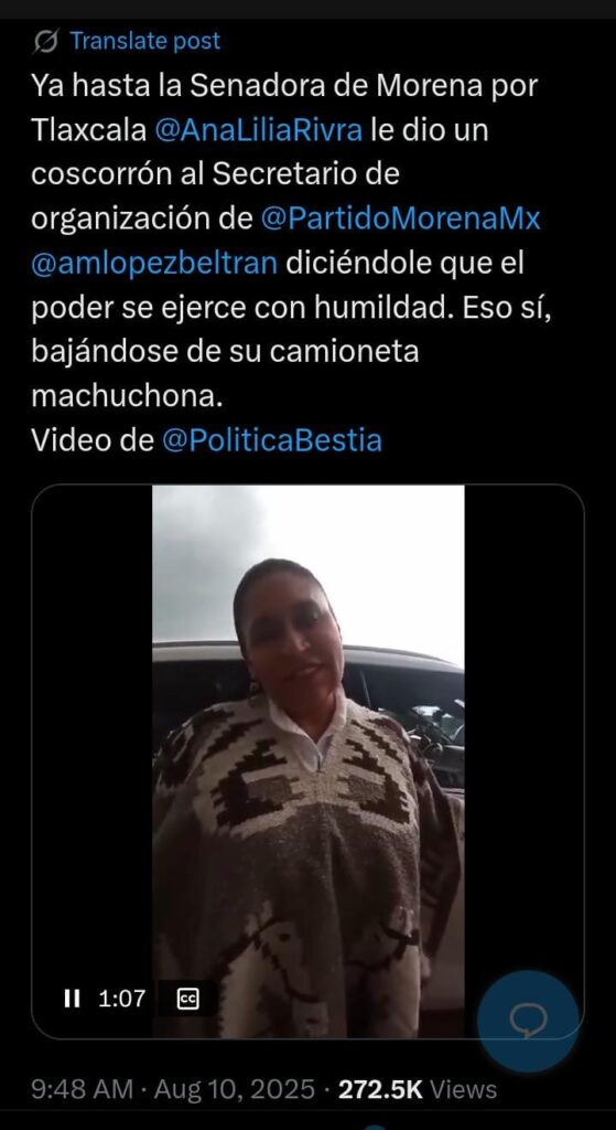 En redes sociales se encendió la polémica tras la difusión de un video que muestra a la senadora de Morena por Tlaxcala, Ana Lilia Rivera, dando un simbólico coscorrón al secretario de Organización del partido, Andrés Manuel López Beltrán, hijo del expresidente Andrés Manuel López Obrador. Con ese gesto, la legisladora le recordó públicamente que “el poder se ejerce con humildad”.