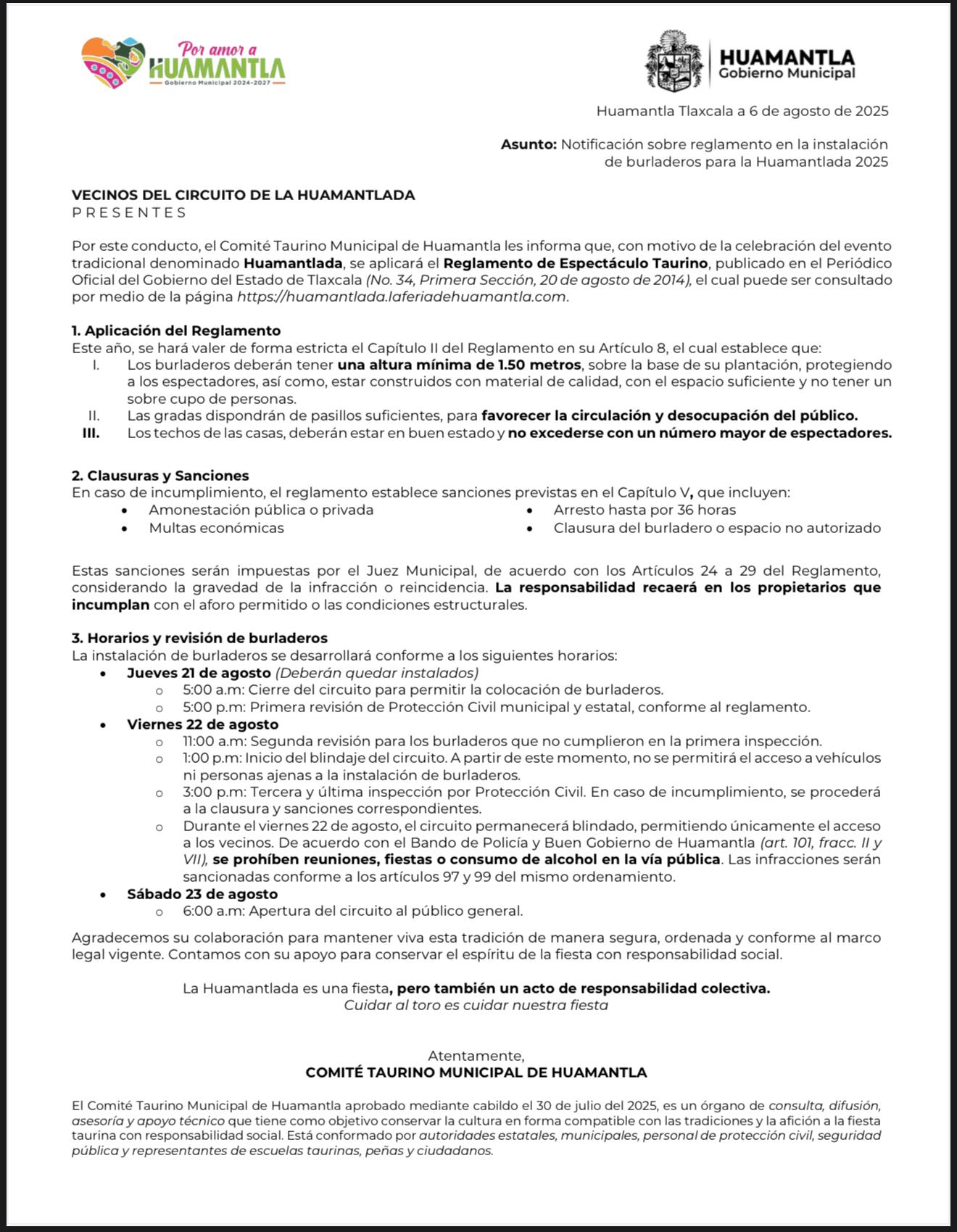 Con la finalidad de cuidar la integridad y seguridad de todos los asistentes al encierro de toros, el Comité Taurino Municipal de Huamantla notifica de manera oficial a todos los vecinos del circuito de la Huamantlada sobre la aplicación estricta del Reglamento de Espectáculo Taurino, publicado en el Periódico Oficial del Gobierno del Estado de Tlaxcala en 2014.