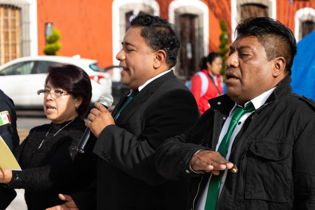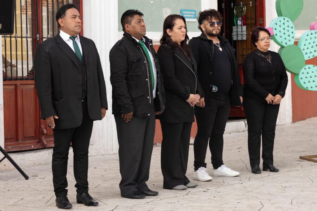 Posteriormente, el presidente de comunidad, Francisco Agustín Saldaña Hernández, dirigió el canto del Himno Nacional Mexicano.