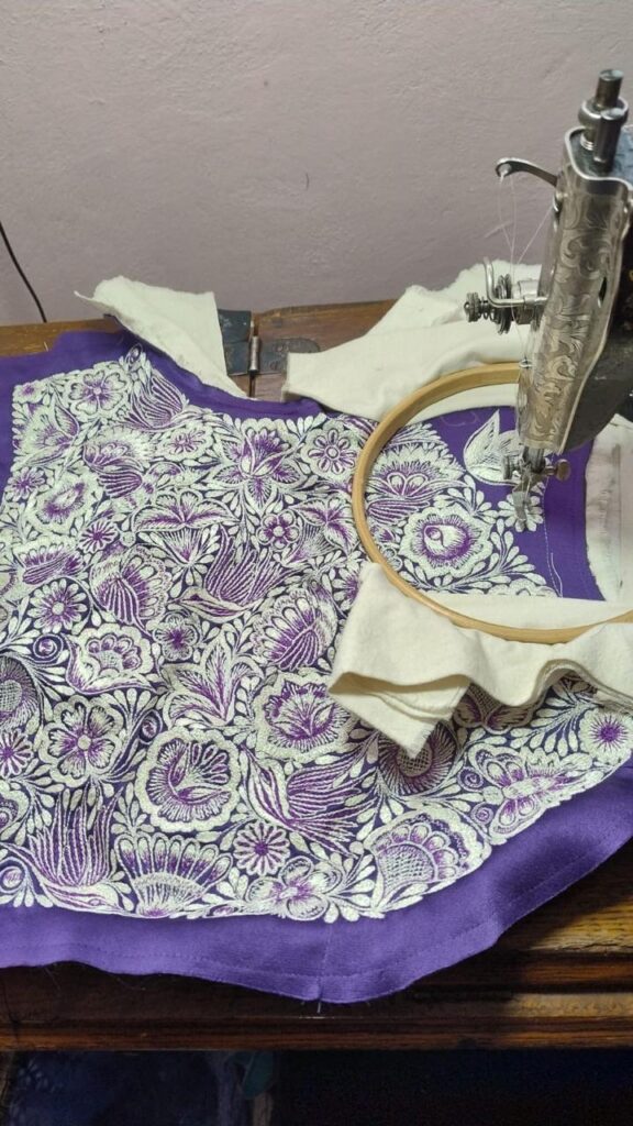 El vestido que lució la presidenta Sheinbaum nació de un trabajo conjunto entre Virginia y la diseñadora Rocío Castro. “Ella se encarga de cortar y confeccionar; yo me encargo de bordar. Nos contactaron a mediados de julio y trabajamos varios meses”, relata.
