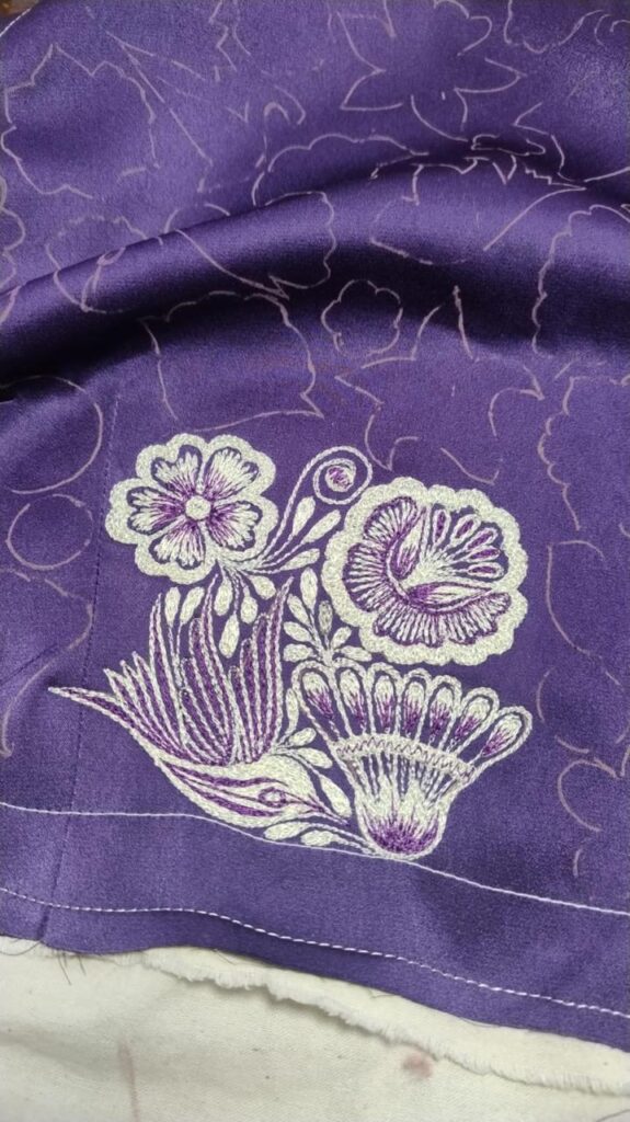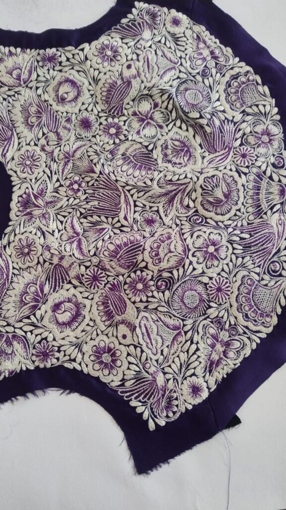 Agregó que la tela elegida fue un tono morado, con bordados en gris y destellos púrpura. El diseño plasmó la flora y fauna de la región, inspirados en el entorno natural de la Malinche.