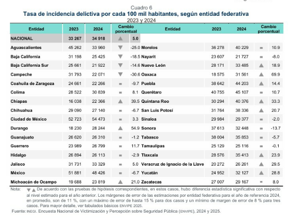En comparación, Oaxaca presentó un aumento del 60.5% en su tasa delictiva, mientras que en Durango el repunte lo colocó en el tercer lugar nacional. Otros estados como el Edoméx (5.7%) y Puebla (15.9%) también reportaron incrementos, aunque menores a los de Tlaxcala.