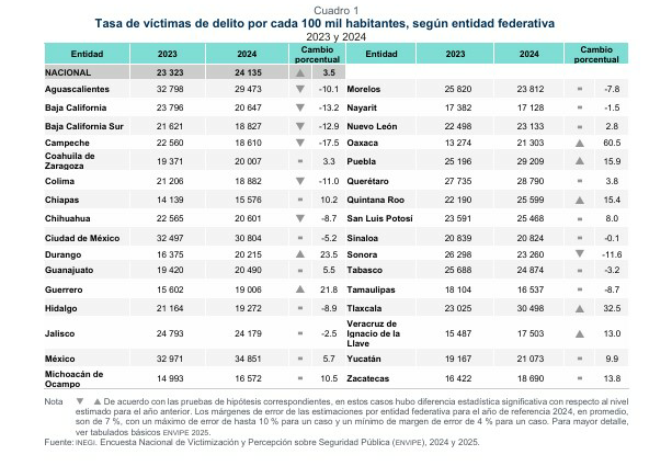 En 2023, Tlaxcala registró 23 mil 025 víctimas de algún delito por cada 100 mil personas, pero un año después esa cifra se disparó a 30 mil 498, un incremento del 32.5%. El dato resulta aún más alarmante si se considera que los tlaxcaltecas sufrieron más ilícitos que los poblanos, cuya tasa fue de 29 mil 209.