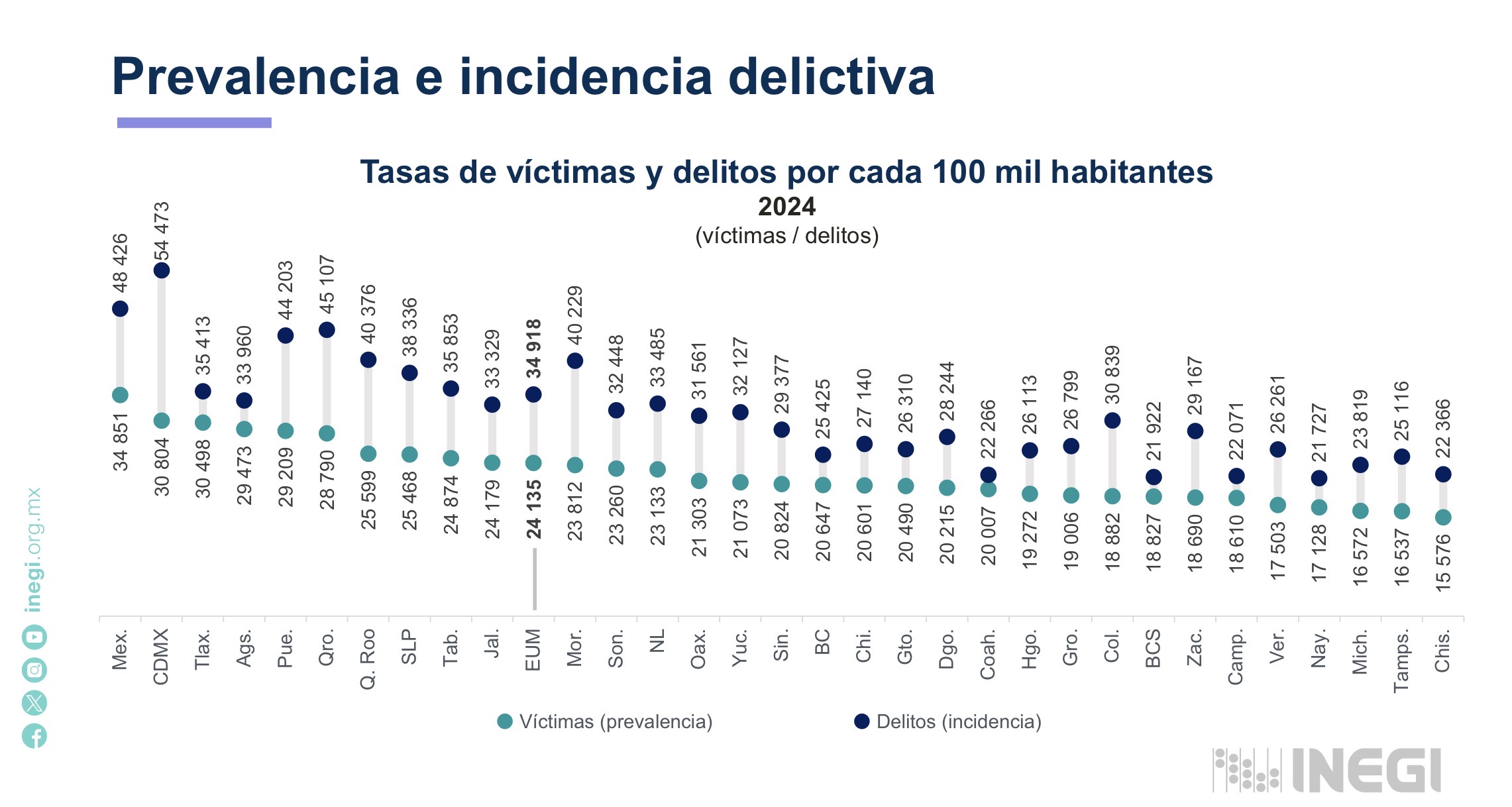 El estudio revela que, mientras el promedio nacional es de 24,207 víctimas por cada 100 mil habitantes, en Tlaxcala la cifra rebasa las 30 mil víctimas, superando incluso a entidades con mayor población como Jalisco, Puebla y Veracruz.