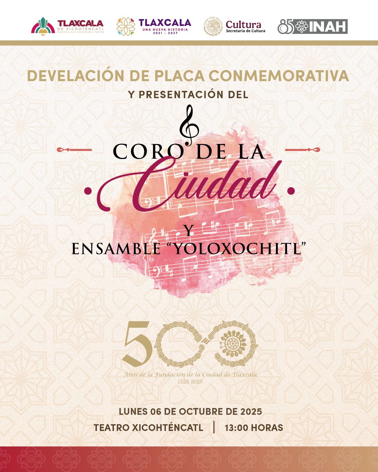 Como parte del programa cultural, el público podrá disfrutar de la presentación del Coro de la Ciudad de Tlaxcala, que compartirá escenario con el ensamble “Yoloxochitl”, en un encuentro musical que promete llenar de voces, armonía y emoción el histórico recinto.