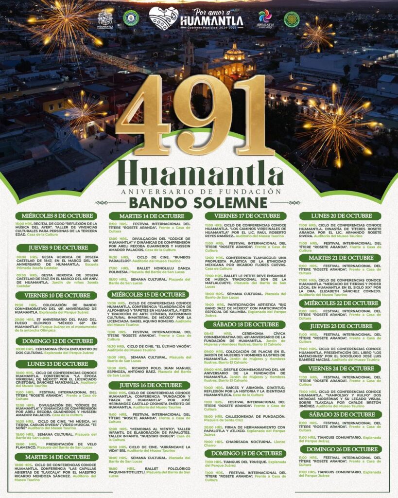 El H. Ayuntamiento de Huamantla, que encabeza el presidente municipal Salvador Santos Cedillo, invita a toda la ciudadanía a formar parte de las actividades conmemorativas por el 491 aniversario de la fundación de Huamantla, una celebración que honra nuestras raíces, tradiciones y el orgullo de ser huamantlecos.
