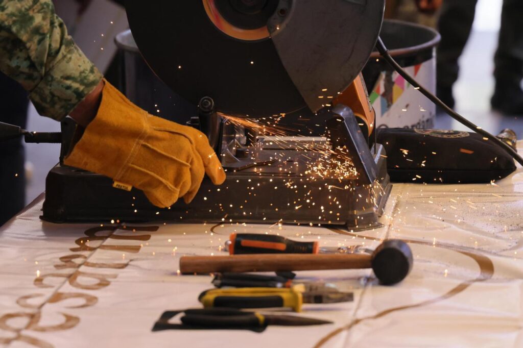 Durante el recorrido, encabezado por la gobernadora Lorena Cuéllar Cisneros, la subsecretaria de Construcción de Paz, Participación Social y Asuntos Religiosos del Gobierno de México, Rocío Bárcena Molina, y la alcaldesa, Ana Lucía Arce Luna, supervisaron la destrucción de un arma de fuego, calibre .22 sin matrícula ni marca, entregada de manera anónima por un ciudadano, quien recibió un estímulo económico de 4 mil 300 pesos, de acuerdo con el tabulador de la Defensa, misma que al momento fue destruida.