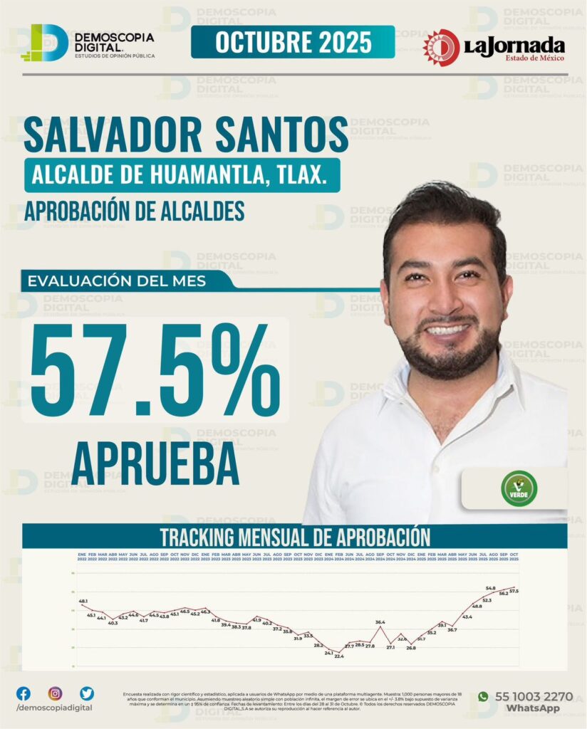 Los más recientes estudios de opinión y mediciones sobre aceptación gubernamental confirman el ascenso constante del presidente municipal Salvador Santos Cedillo, quien continúa fortaleciendo su nivel de aprobación gracias al trabajo permanente y los resultados visibles al frente de la administración de Huamantla.