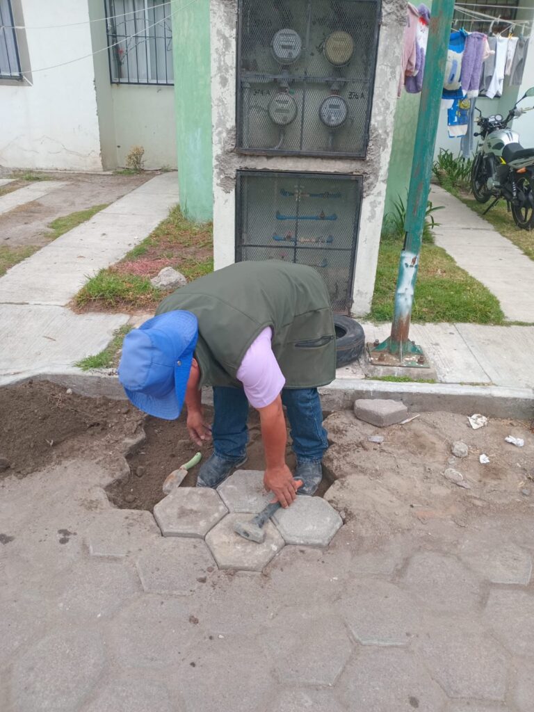 Asimismo, se efectúan trabajos de colocación de adoquines en calle San Luis, como parte del seguimiento a las intervenciones realizadas previamente en la red de agua potable, asegurando con ello la correcta rehabilitación de la vialidad.