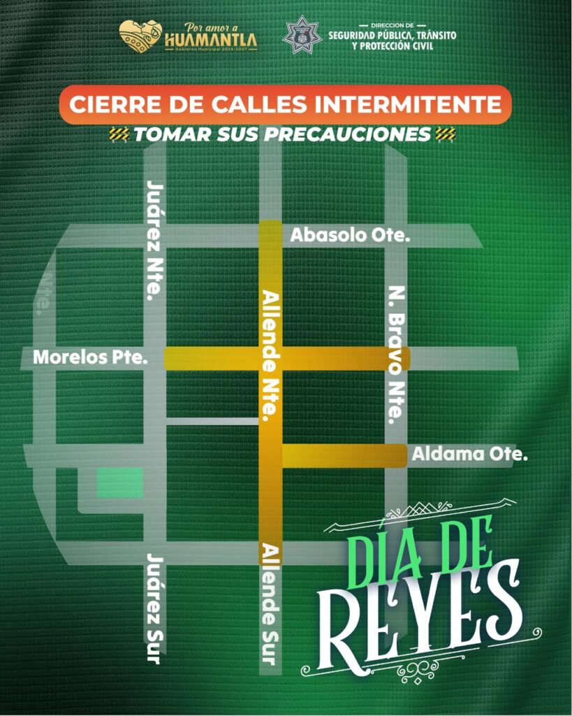 El Gobierno Municipal de Huamantla informa a la ciudadanía que, con motivo de la instalación del tradicional Mercado de Día de Reyes, se llevará a cabo el cierre temporal de algunas vialidades del centro del municipio.