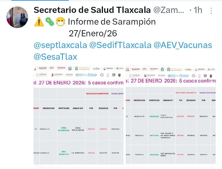 Zamudio Meneses publicó en su cuenta de «X» los informes del comportamiento de la enfermedad en Tlaxcala, donde se dieron a conocer los tres casos positivos identificados recientemente. En todos ellos, se han implementado cercos sanitarios para completar los esquemas de vacunación en la población cercana a los casos identificados.