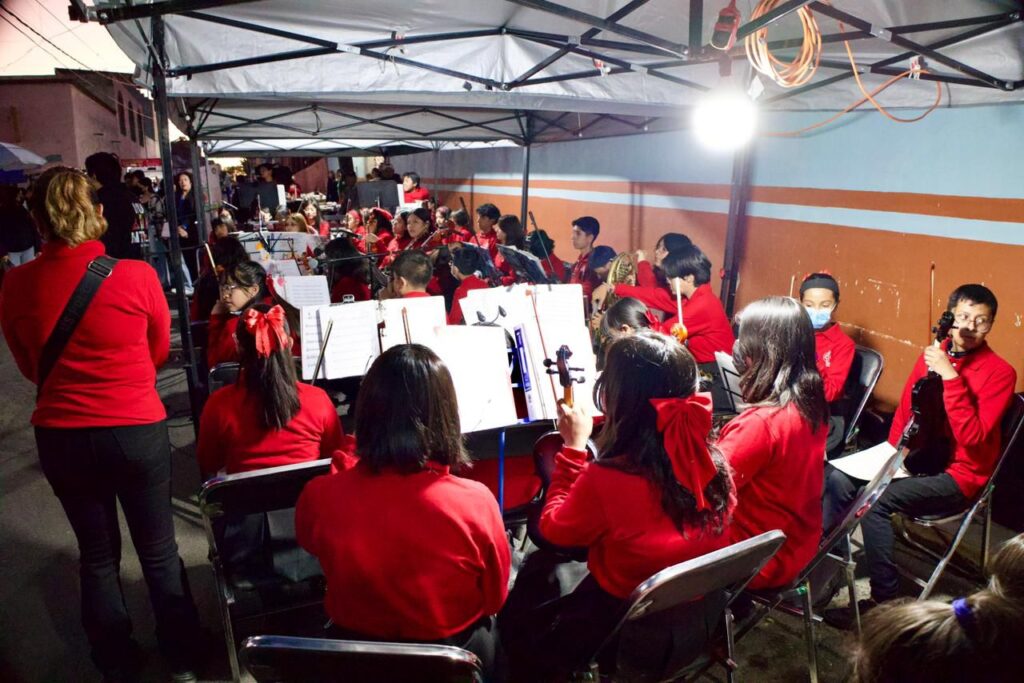 La música de la Orquesta Sinfónica Infantil y Juvenil fue la encargada de amenizar el encuentro, en el que niñas, niños y adolescentes demostraron su talento en la ejecución de diversos instrumentos, llenando el ambiente de entusiasmo y captando la atención de los asistentes.