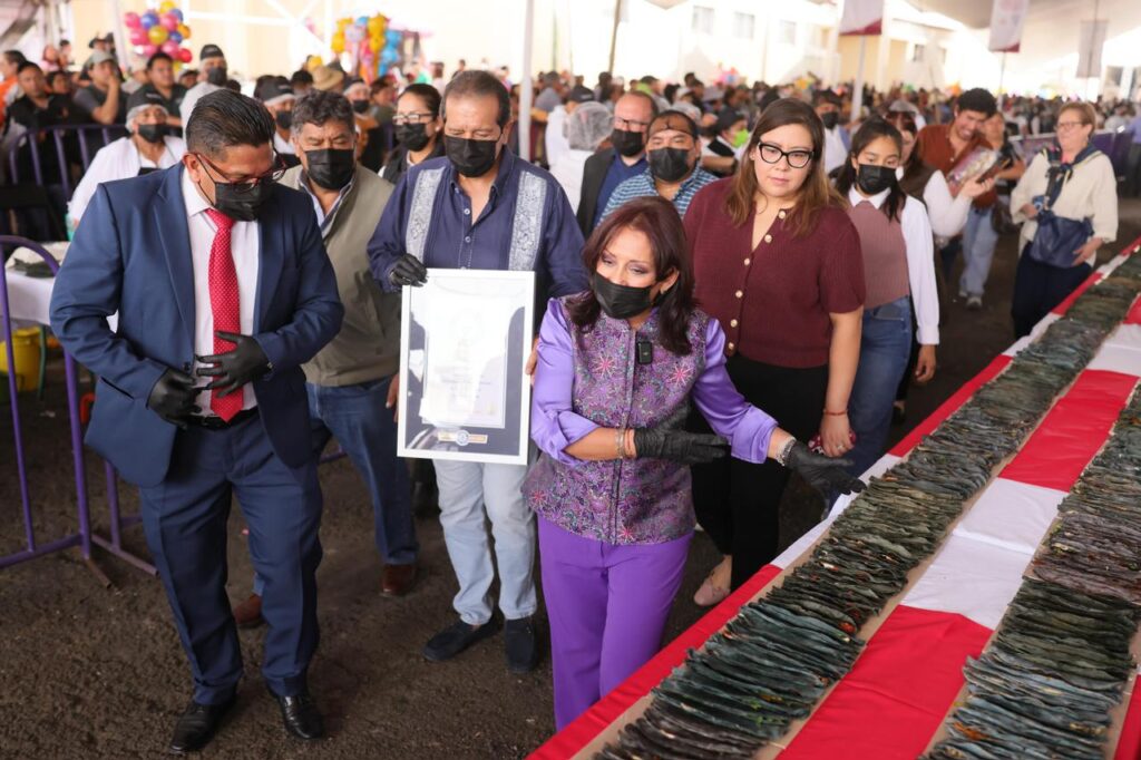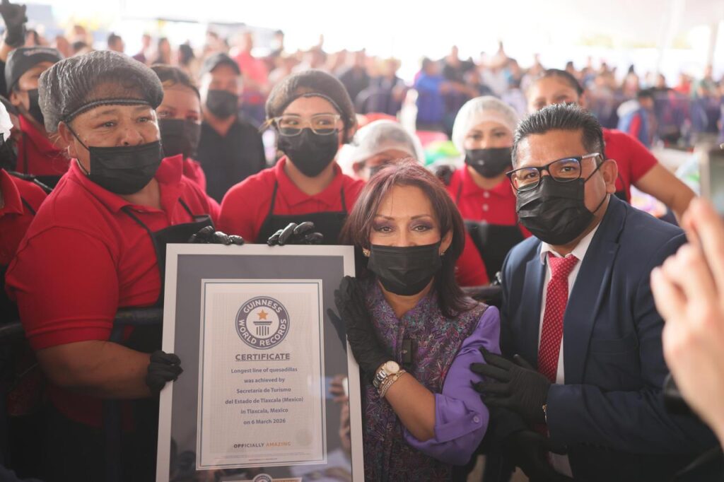 Tlaxcala logró el nuevo título mundial de Récord Guinness por “la línea de quesadillas más grande del mundo”, en el marco de la inauguración de la Feria de la Quesadilla y el Tlacoyo 2026, en Santa Ana Nopalucan, reconocimiento que recibieron la gobernadora Lorena Cuéllar Cisneros y el presidente municipal Pedro Pérez Vázquez de manos de la adjudicadora oficial de Guinness World Records para América, Susana Reyes.