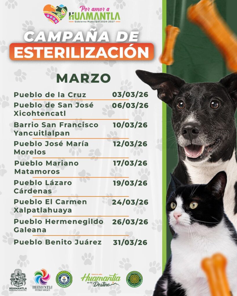 Como parte de estas acciones, se informa a la ciudadanía que las próximas fechas serán el 19 de marzo en la comunidad de Lázaro Cárdenas y el 24 de marzo en El Carmen Xalpatlahuaya, donde se brindarán esterilizaciones gratuitas para perros y gatos, tanto machos como hembras, a partir de los tres meses de edad, en un horario de 9:00 a 13:00 horas.