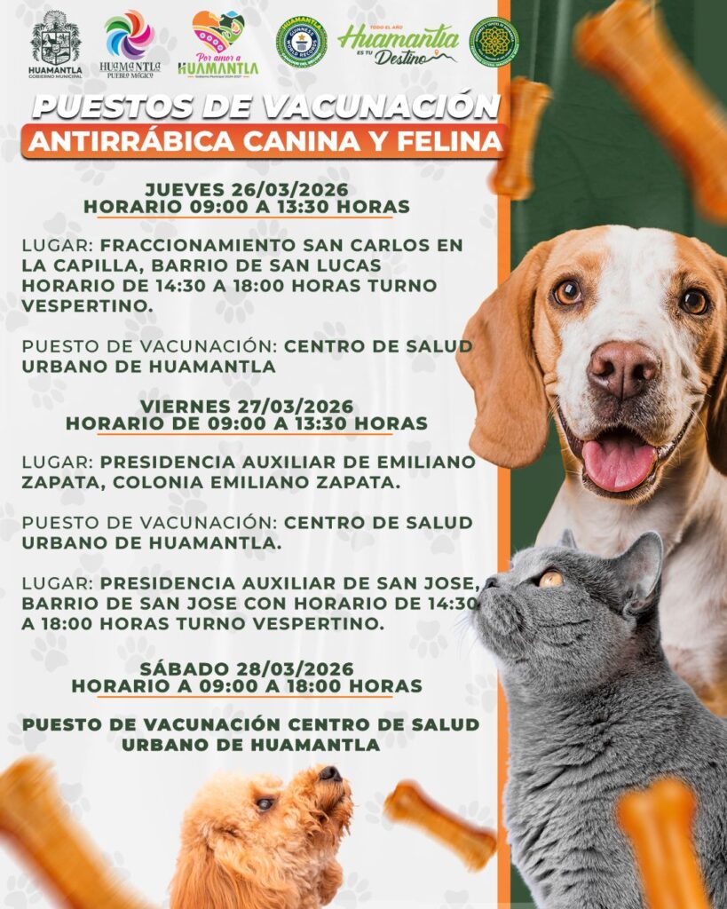 El Gobierno Municipal de Huamantla, en coordinación con el Centro de Salud Urbano, invita a la ciudadanía a participar en la Jornada de Vacunación Antirrábica Canina y Felina, que se llevará a cabo del 25 al 28 de marzo de 2026 en distintos puntos de la ciudad.