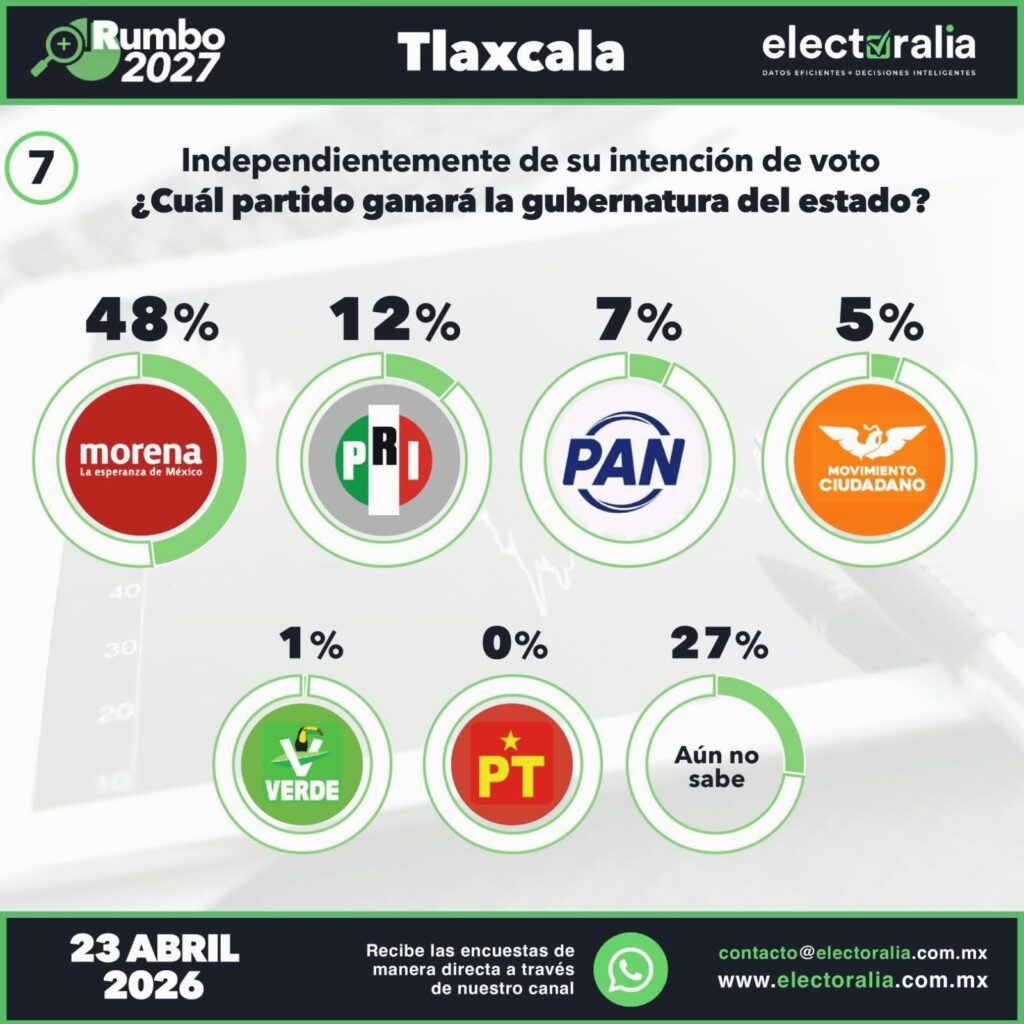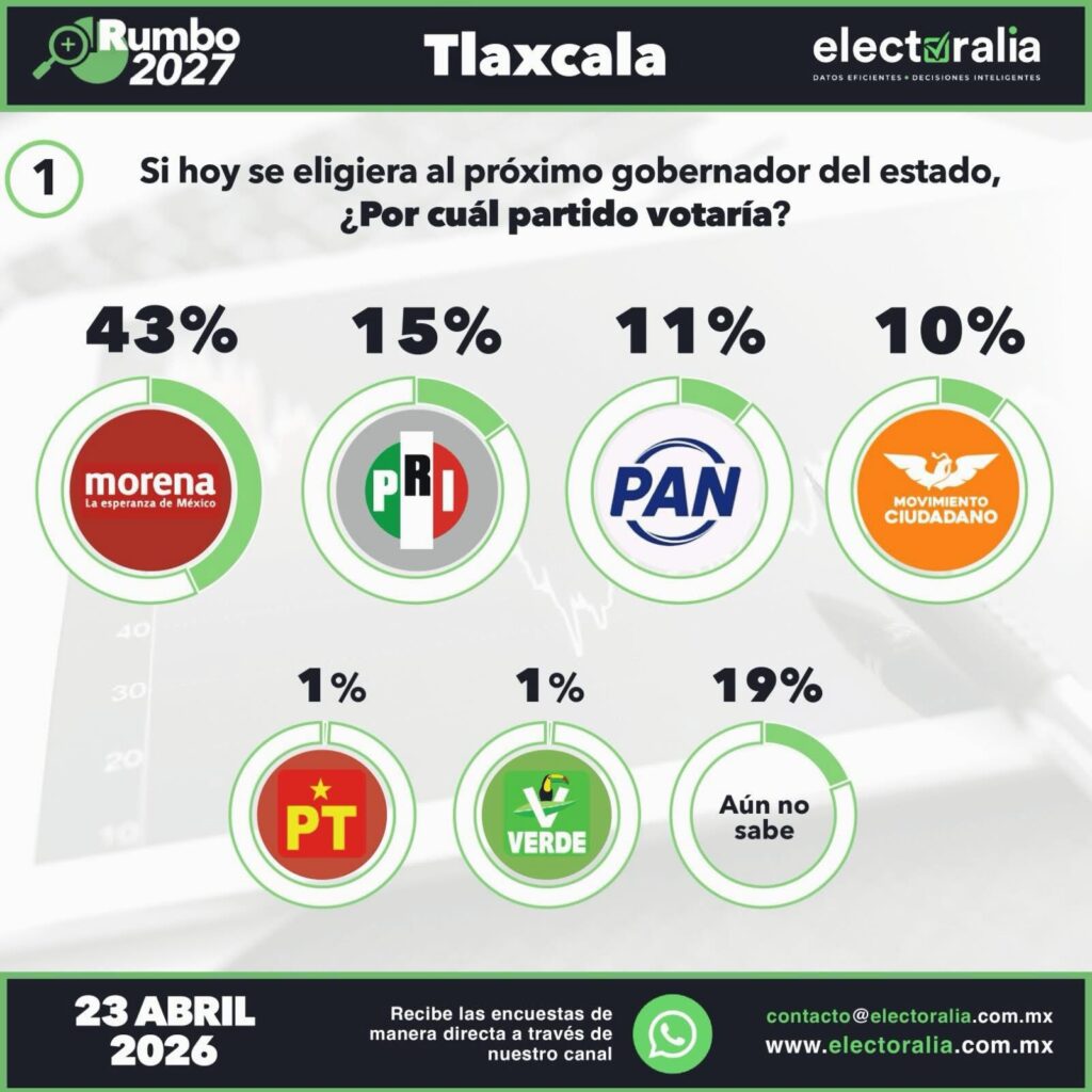El panorama electoral en Tlaxcala comienza a perfilarse con claridad. De acuerdo con la encuestadora Electoralia, Morena se mantiene como la fuerza política dominante en el estado, al alcanzar un 43% de intención de voto rumbo a la elección de gobernador.