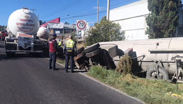 TRÁNSITO LENTO EN LA CARRETERA APIZACO–TLAXCALA TRAS VOLCADURA DE PIPA CON COMBUSTIBLE